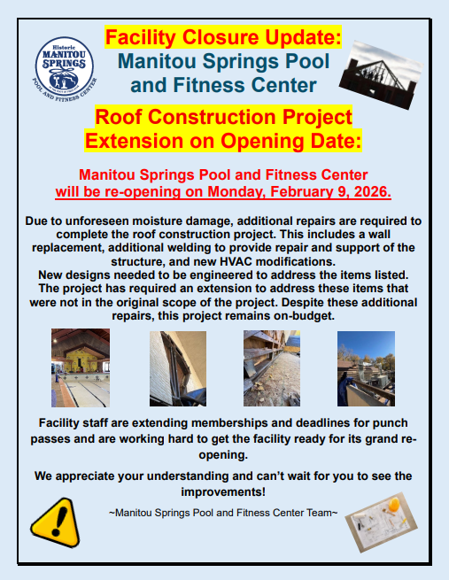 · In the event of an extended mandated shutdown of the Manitou Springs Pool and Fitness Center due to Construction Projects, Public Health orders or emergencies, punch passes and memberships will have their expiration dates extended to the amount of time of the extended closure.